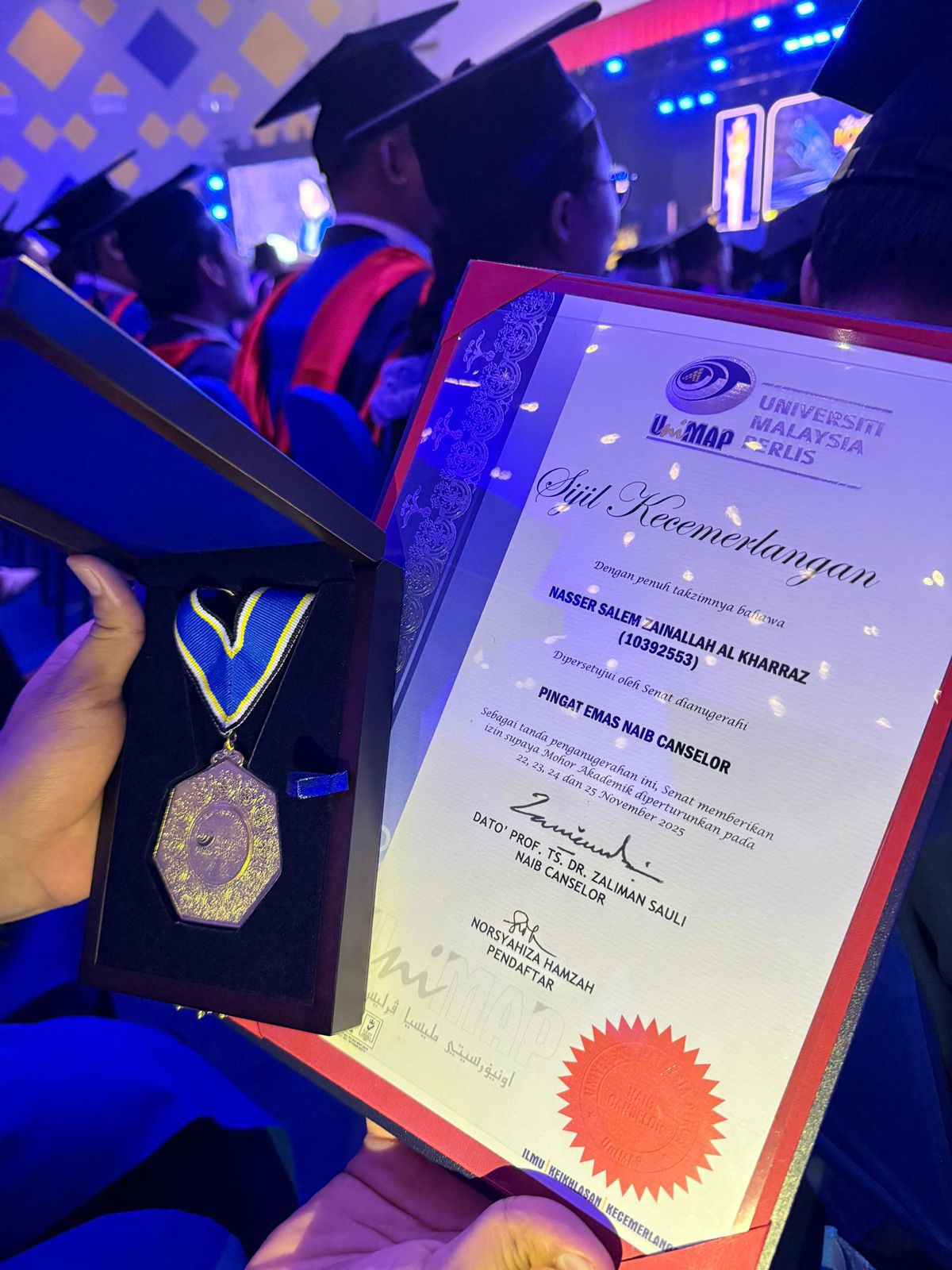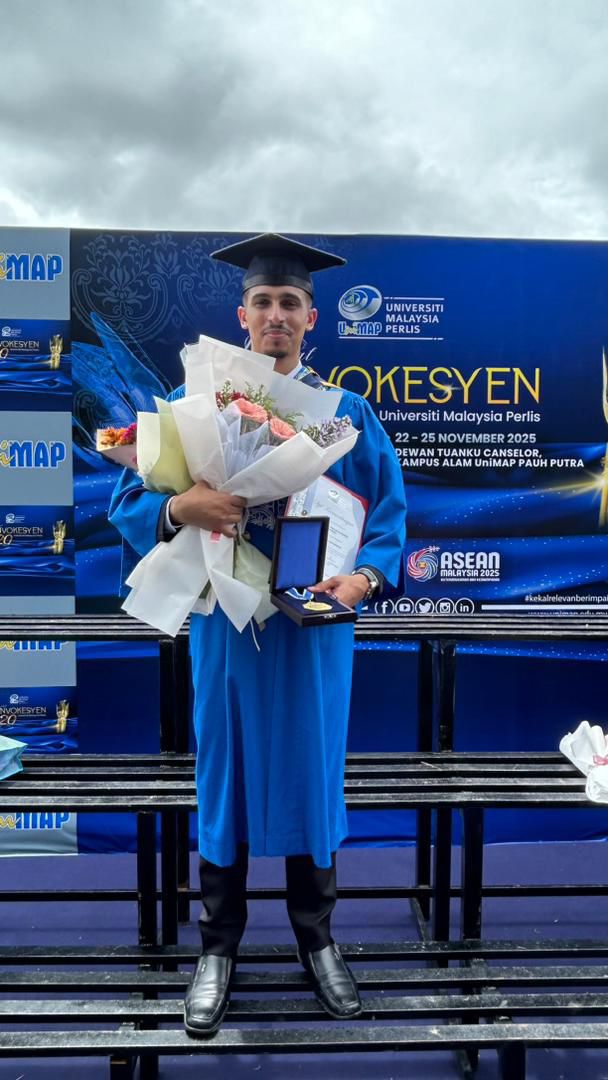 من جامعة برليس (UniMAP) الماليزية وحصوله على درجة البكالريوس في الهندسة الميكانيكية كافضل طالب دولي في الجامعة وذلك في الحفل الذي أقيم في ولاية برليس وحضره ولي العهد توانكو سيد فائز الدين بوترا جمال الليل.