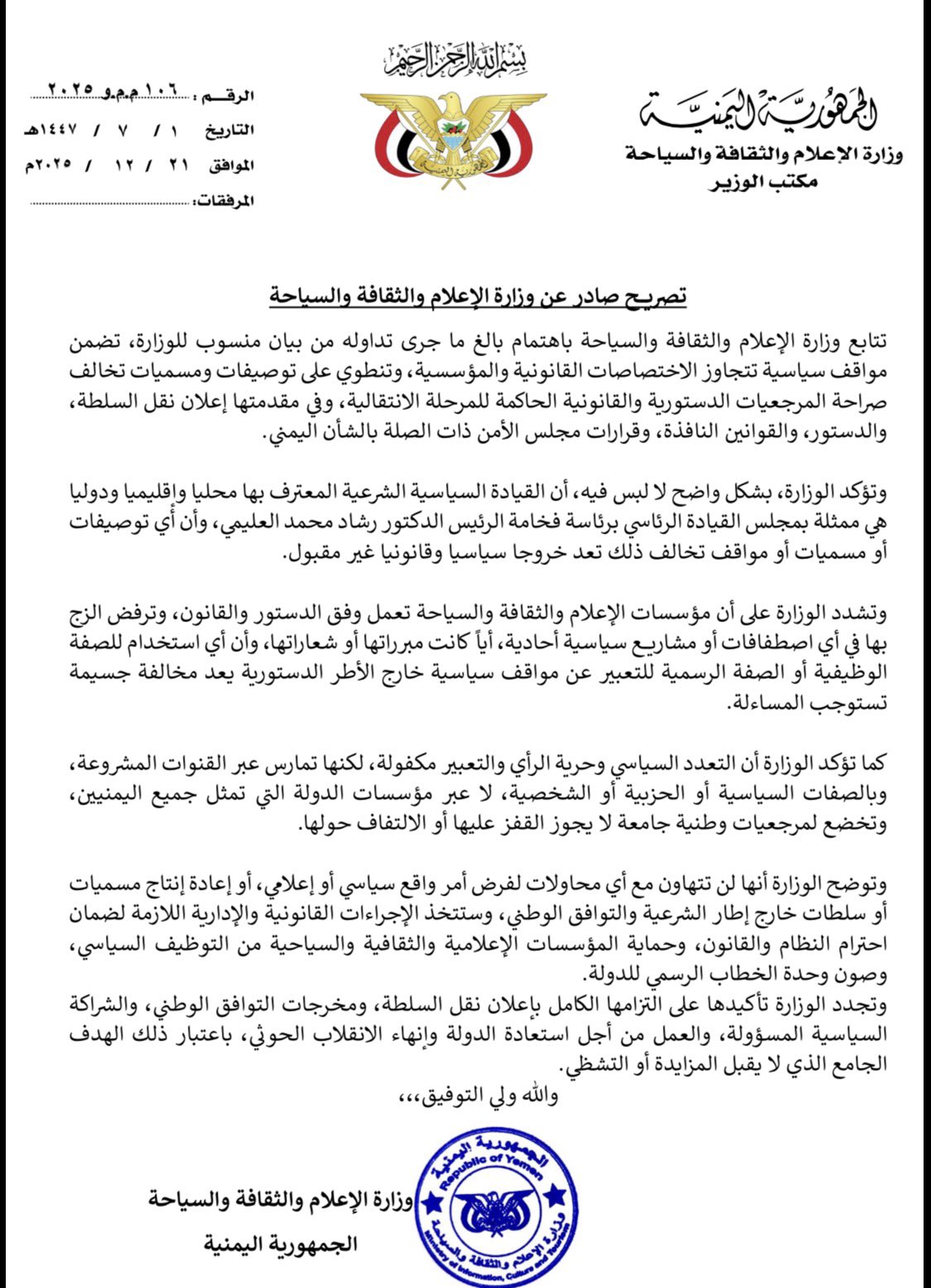 وتوضح الوزارة أنها لن تتهاون مع أي محاولات لفرض أمر واقع سياسي أو إعلامي، أو إعادة إنتاج مسميات أو سلطات خارج إطار الشرعية والتوافق الوطني، وستتخذ الإجراءات القانونية والإدارية اللازمة لضمان احترام النظام والقانون، وحماية المؤسسات الإعلامية والثقافية والسياحية من التوظيف السياسي، وصون وحدة الخطاب الرسمي للدولة.
