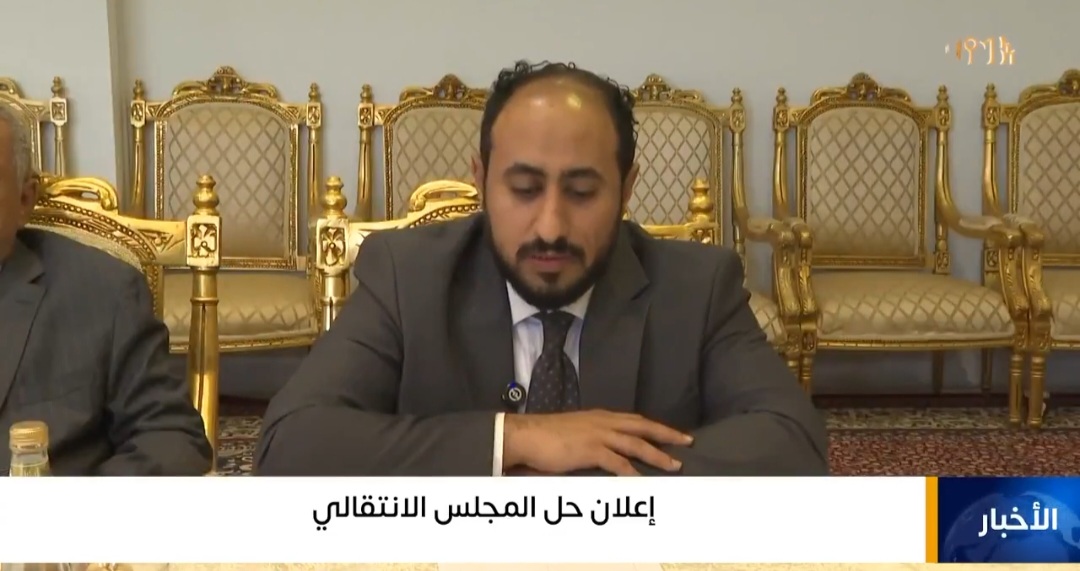 وقد نشر محرر الشؤون اليمنية بقناة الجزيرة احمد للشلفي مقطع فيديو لعبدالرحمن جلال الصبيحي، الأمين العام للمجلس الانتقالي، في بيان مقتضب قبل قليل من الرياض :يعلن فيه حلّ المجلس الانتقالي بكافة هيئاته ومؤسساته، ابتداءً من تاريخ اليوم.