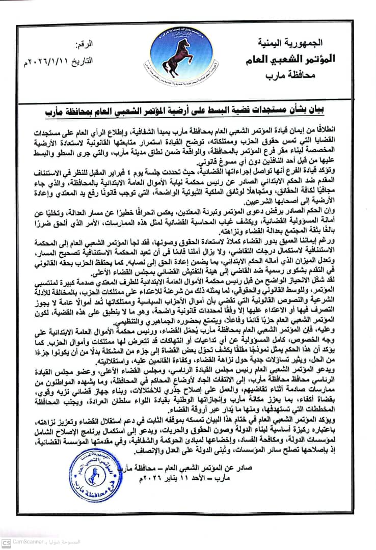 انطلاقًا من إيمان قيادة المؤتمر الشعبي العام بمحافظة مأرب بمبدأ الشفافية، وإطلاع الرأي العام على مستجدات القضايا التي تمس حقوق الحزب وممتلكاته، توضح القيادة استمرار متابعتها القانونية لاستعادة الأرضية المخصصة لبناء مقر فرع المؤتمر بالمحافظة، والواقعة ضمن نطاق مدينة مأرب، والتي جرى السطو والبسط عليها من قبل أحد النافذين دون أي مسوغ قانوني.