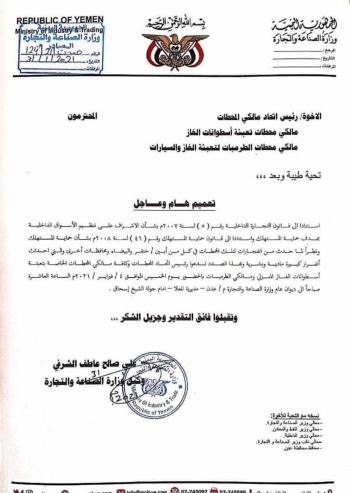 وزارة الصناعة توجه تعميما هاما وعاجلا الى مالكي محطات الغاز والطرمبات بعدن...