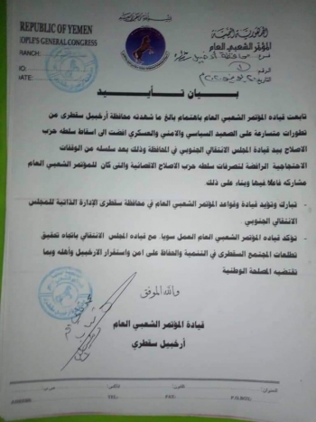 أول تعليق من المؤتمر الشعبي العام بشأن بيان تأييد لسيطرة الانتقالي على سقطرى...