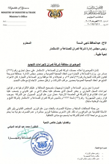 افادت وثيقة صادرة من وزير الصناعة والتجارة بإلغاء سجلات شركة كمران وذلك بسبب فصل الشركة عن الميليشيا الحوثية واستعادتها لصالح الشرعية...