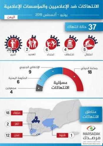 كشف تقرير صادر عن مرصد الحريات الاعلامية عن تسجيل 37 انتهاك ضد الحريات الاعلامية في اليمن خلال شهري يوليو واغسطس الماضيين من العام الحالي...