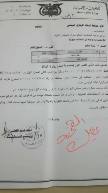 بتوجيهات سابقة من رئيس الجمهورية للحكومة بإعتماد وصرف مليار ريال للإستعداد لتحرير محافظة إب ،يضاف اليها نصف مليار عند عملية البدء...