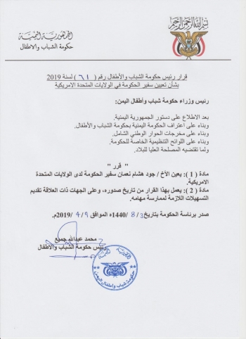 عاجل : تعيين سفيراً لليمن في الولايات المتحدة الأمريكية ومندوبا دائما "قرار_صورة