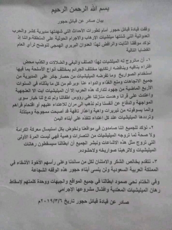 اصدرت قبائل حجور بمحافظة حجة شمال اليمن بيانا توضيحي بشإن الجرائم التى ترتكبها مليشيا الحوثي بحق المدنيين في مديرية كشر بحجة.