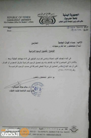 اثار تعميم تم نشره من قبل جامعة حضرموت صباح الامس حول الرسوم الدراسية سخط الطلاب الدارسين والملتحقين بكليات الجامعة....
