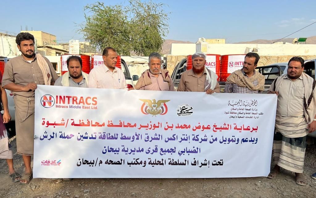 دشنت السلطة المحلية بمديرية بيحان محافظة شبوة ممثلة بمدير المديرية أ. محمد أحمد شيخ، ومدير مكتب الصحة مدير مستشفى بيحان أ. عبدالله الباني، وبرعاية الشيخ عوض بن الوزير العولقي محافظ محافظة شبوة، مساء اليوم، حملة الرش الضبابي لجميع قرى مديرية بيحان.