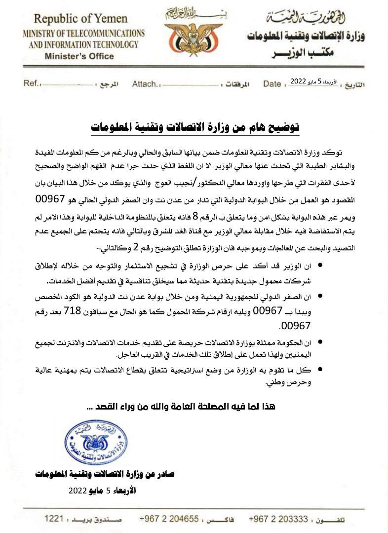 وزارة الاتصالات وتقنية المعلومات في اليمن تصدر بيان توضيحي حول اللغط الدائر حول قضية الصفر الدولي