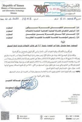 وحسب ما نشرته قناة الحدث العربية فقد أظهرت وثيقة بتاريخ 4 يونيو 2022 توجيهًا من وزير الاتصالات في حكومة الميليشيات غير المعترف بها دوليًا، إلى مديري شركات الاتصالات، بتوريد 1% من كل فاتورة اتصالات بجميع أنواعها (ثابت- جوال- دولي- إنترنت) إلى صندوق أسر القتلى الحوثيين.