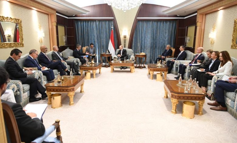 ووفقا للوكالة الرسمية، فإن العليمي طالب دول الاتحاد الأوروبي بالضغط على المليشيا الحوثية، وإلزامها بالوفاء بتعهداتها بما في ذلك فتح طرق تعز والمحافظات الأخرى، ودفع رواتب الموظفين من عائدات سفن الوقود.