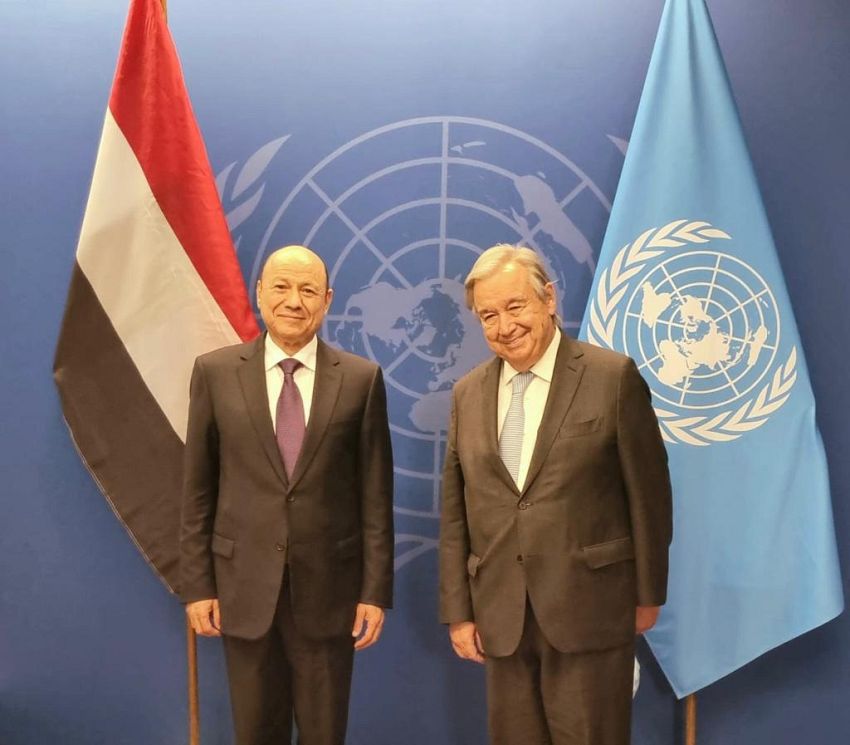 التقى الرئيس الدكتور رشاد محمد العليمي، رئيس مجلس القيادة الرئاسي، الامين العام للأمم المتحدة أنطونيو غوتيريش للبحث في مستجدات الوضع اليمني، وذلك على هامش اجتماعات الجمعية العامة للأمم المتحدة التي انطلقت اعمالها الثلاثاء.