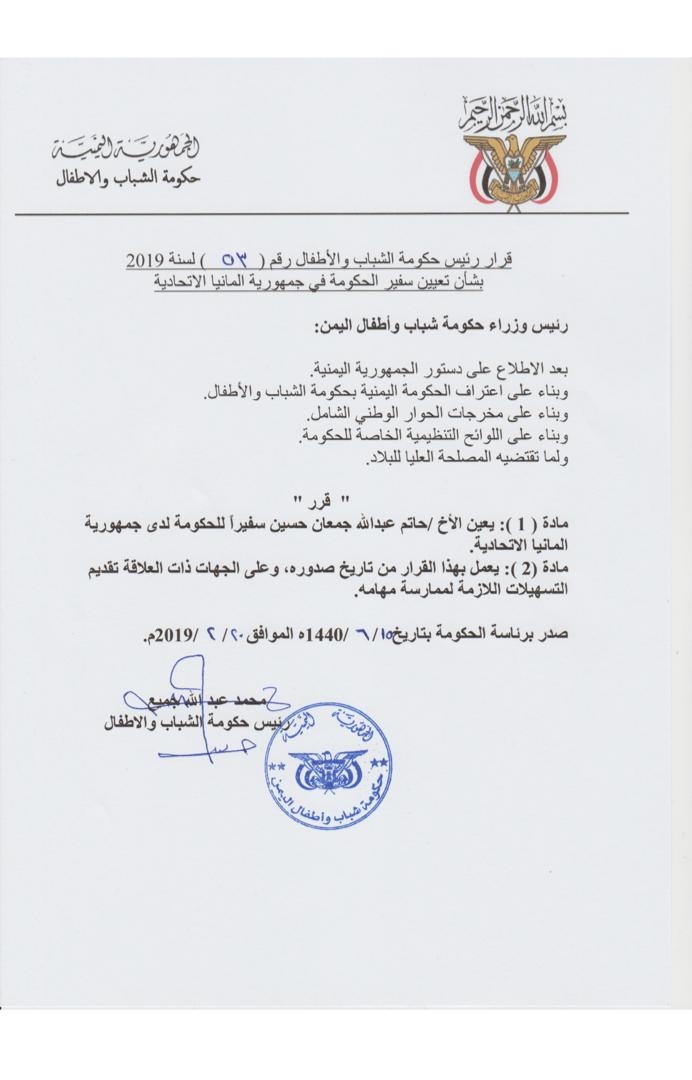 قرار رئيس حكومة الشباب والأطفال رقم (٥٣)لعام2019 بشأن تعيين سفير حكومة بلادنا لدى ألمانيا