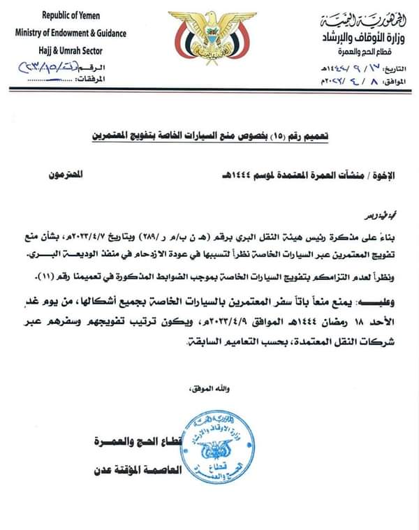 أصدرت وزارة الأوقاف والإرشاد اليمنية، اليوم، تعميما للمسافرين إلى المملكة العربية السعودية عبر منفذ الوديعة.