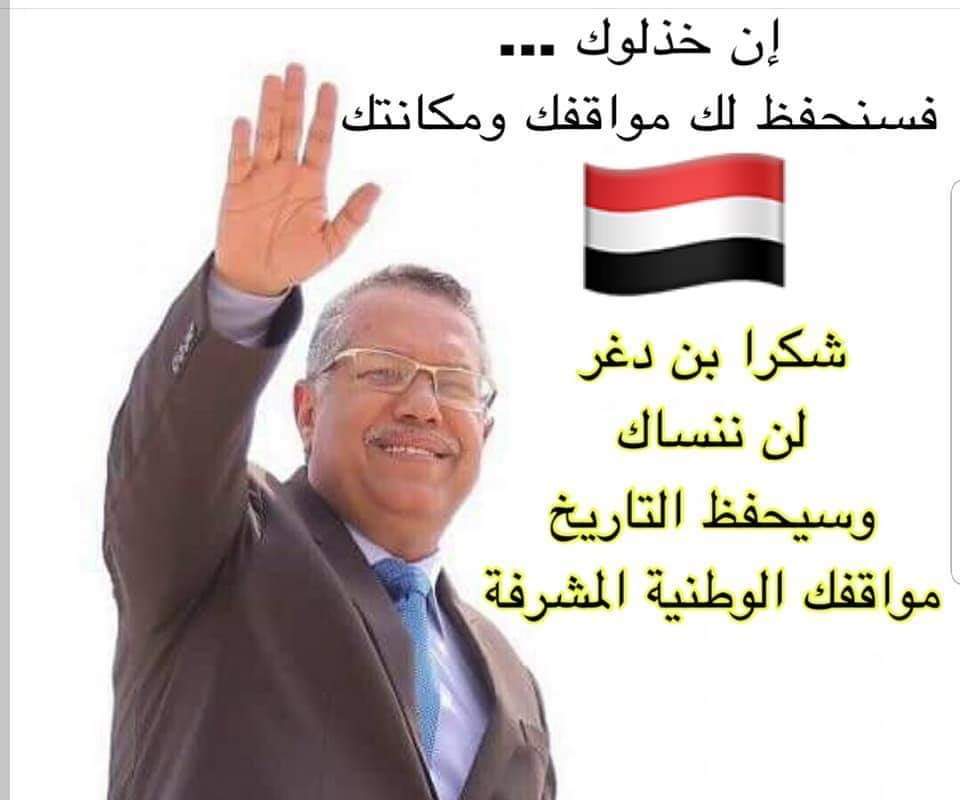 وأضاف البعداني «بل اصبح بن دغر يتكلم بالكلام الذي ينبغي أن يقوله خلفه الدكتور ( معين) الممنوع من السياسة والدهون . في حين ظنت بعض الجهات ان بن دغر سيهرول اليها كما فعل الكثير غيره كنوع من ردة الفعل على تغييره ، بل وربما الجهة التي اصدرت القرار كانت تريد دفعه الى ذلك ، ولكنه خيب ظن الجميع . لم تعطي الرجل قدره واعتقدت تلك الجهات ان بن دغر لا يختلف عن البقية ولكنها لم تعرف جيدا عقلية الرجل ومكانته (انه قارئ التاريخ ) ويعرف ان التاريخ لا يرحم) . »