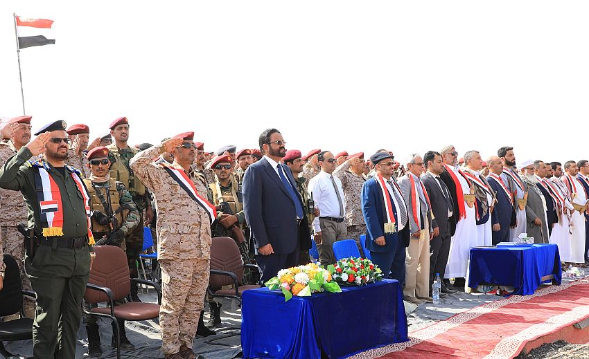 وقال : " إنه لمن دواعي سروري أن أقف اليوم أمام هذا العرض الرمزي لوحدات نوعية من الجيش والأمن بالتزامن مع احتفالات شعبنا بأعياد الثورة اليمنية التي انطلقت من أجل حرية الوطن وكرامة الإنسان وقضت على الاستبداد والاستعمار، وبددت ظلمات العهد البائد، وصنعت مجداً خالداً ليمن الإيمان والحكمة وأعادت له مكانته التاريخية بين الشعوب، ولا تزال الثورة مصدر إلهام للشعب اليمني في نضاله اليوم ضد ميليشيات التمرد والإرهاب التي تريد لليمن التخلف والاستعباد والتبعية لإيران ".