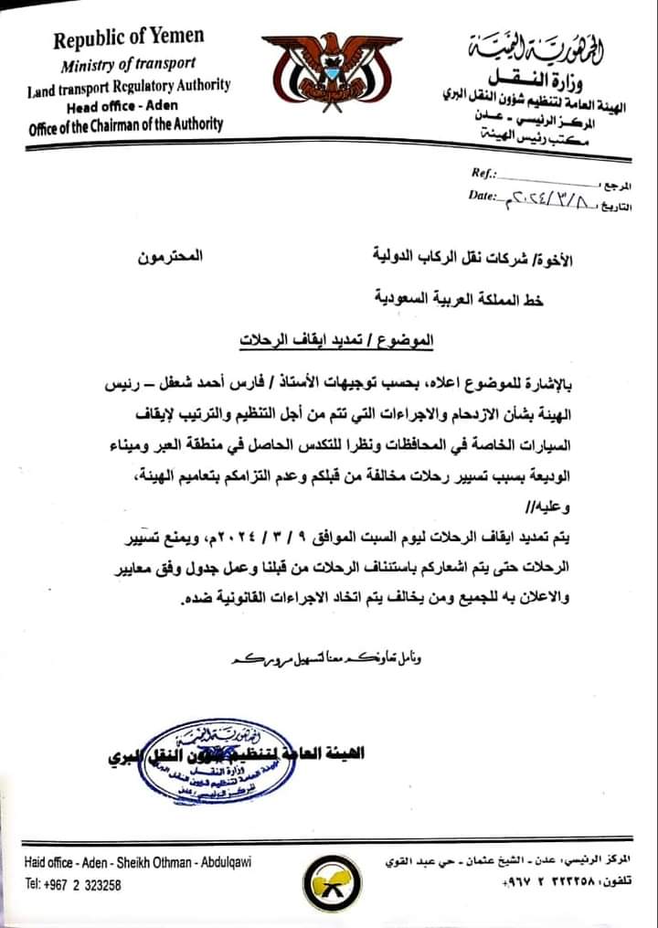 بينها العسل والسمن والدخان .. صدور تعميم من وزارة النقل اليمنية لكل المسافرين من اليمن إلى المملكة العربية السعودية (صور وثائق )