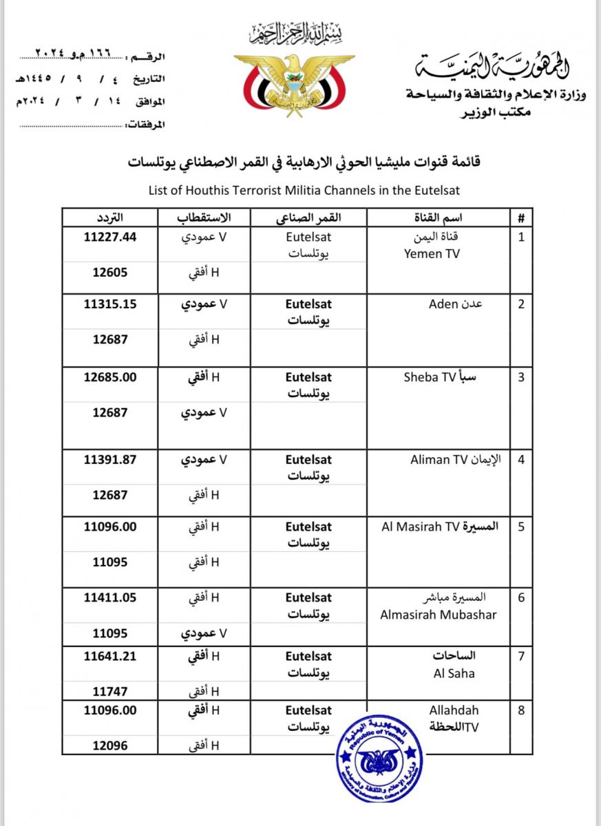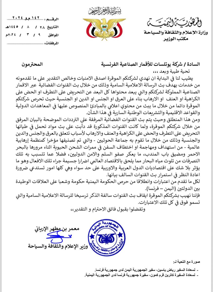 وجه وزير الإعلام والثقافة والسياحة معمر الارياني مذكرة لشركة الأقمار الاصطناعية الفرنسية "Eutelsat" للمطالبة بحجب شارة قائمة القنوات الفضائية المنتحلة صفة القنوات الحكومية اليمنية، وقنوات (المسيرة، المسيرة مباشر، الساحات، اللحظة) وايقاف الحيزات الترددية التي تبث من خلالها، إستنادا إلى قرار الحكومة اليمنية لعام 2022م بتصنيف جماعة الحوثي منظمة ارھابیة، وقرار الادارة الامريكية بتصنيفها كجماعة إرهابية عالمية، وللحد من خطر هذه الجماعة الذي فاق كل الجماعات الارهابية