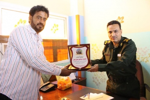 كرم رئيس اللجنة التحضرية الخاصة بإعلان واشهار المشروع الوطني الشبابي العدني خالد الحميقاني، اليوم في العاصمة المؤقتة عدن، مدير ادرة التوجيه المعنوي والعلاقات العامة بوزارة الداخلية العميد عبد القوي باعش.