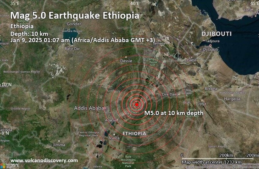 وبحسب هيئة المسح الجيولوجي الأمريكية، وقع الزلزال الأول بقوة 4.9 درجة على مقياس ريختر على بعد 23 كيلومترا شمال آواش، على عمق 10 كيلومترات تحت سطح الأرض.