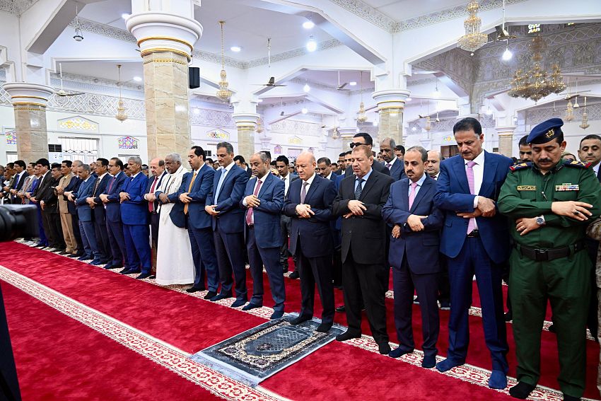 ادى الرئيس الدكتور رشاد محمد العليمي، رئيس مجلس القيادة الرئاسي، اليوم الجمعة، صلاة عيد الاضحى المبارك مع كبار قيادات الدولة، وجموع المصلين في العاصمة المؤقتة عدن.