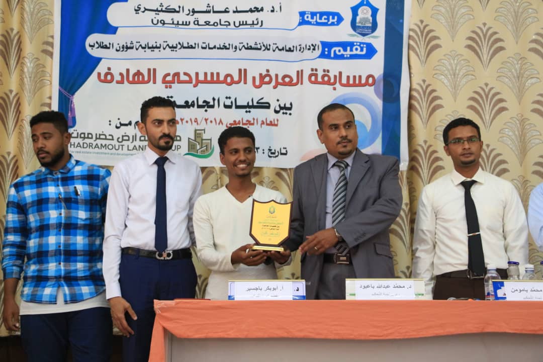 بينما حصلت كلية التربية على المركز الثالث بعنوان النص《البحث عن ملامح وطن》والمركز الرابع كلية العلوم الإدارية عنوان النص 《نور وادي الحضارم》