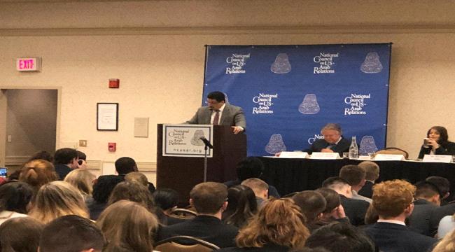 (جاء ذلك خلال كلمته في اللقاء السنوي للجامعات الامريكية ( نموذج الجامعة العربية ) والذي ينظمه المجلس القومي للعلاقات الأمريكية العربية بحضور ممثلين من السلك الدبلوماسي والأكاديميين وعدد كبير من طلاب العلوم السياسية والمهتمين بالشرق الأوسط يمثلون ٢٥ جامعة أمريكية .