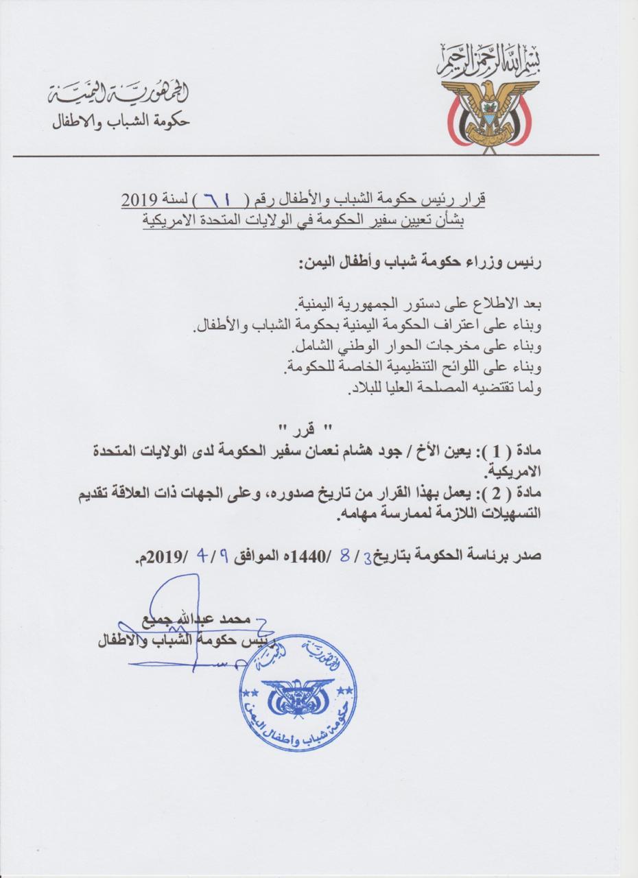ونصت المادة الثانية بتعيين جود هشام عبدالجليل نعمان سفيرا ومندوبا دائما للحكومة لدى الولايات المتحدة الأمريكية والأمم المتحدة.