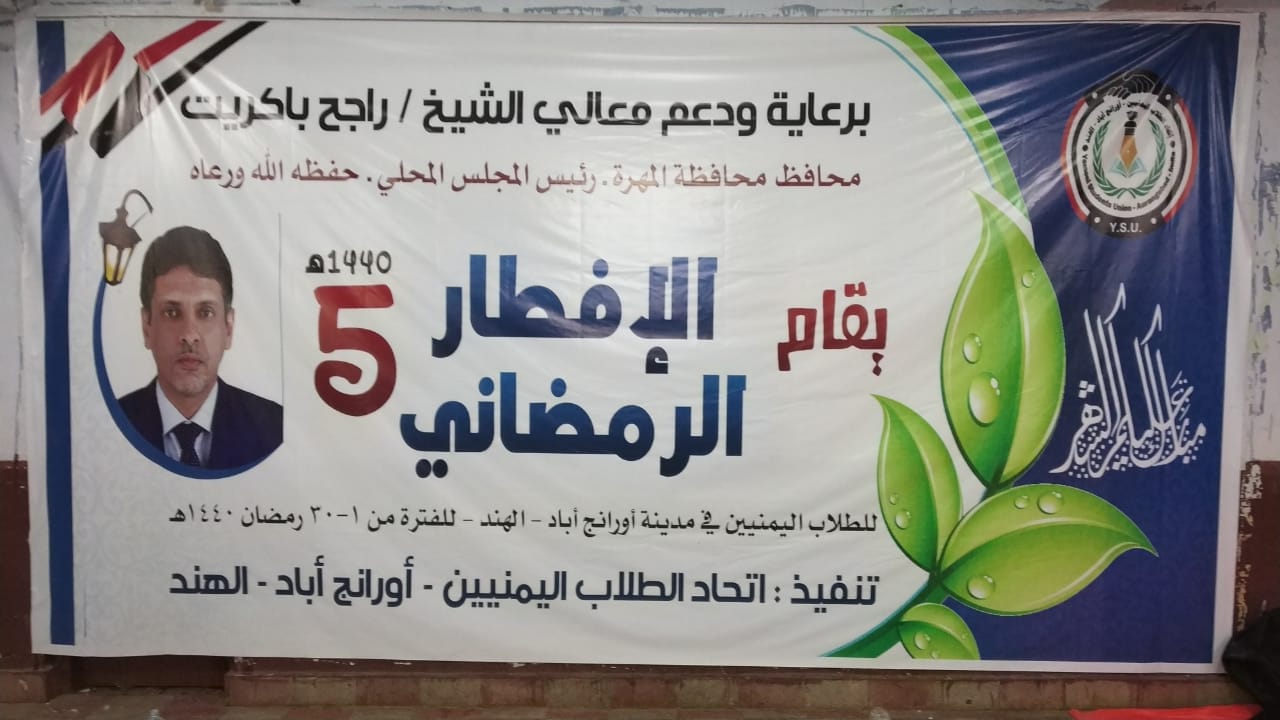 بدعم ورعاية كريمة من الشيخ راجح سعيد باكريت محافظ محافظة المهرة رئيس المجلس المحلي بالمحافظة دشن اتحاد الطلاب اليمنيين اورنج آباد - الهند مشروع الإفطار الرمضاني الخامس للعام 1440هـ ، وبهذه المناسبة تقدم اتحاد الطلاب اليمنيين بمدينة أورنج آباد الهند بإسم كل الطلاب اليمنيين بالمدينة وفي مقدمتهم طلاب محافظة المهرة بالشكر والإمتنان وجميل العرفان لمعالي الشيخ راجح سعيد باكريت حفظه الله ورعاه لهذه اللفتة الانسانية الكريمة للطلاب اليمنيين في المهجر كما عُرف عن سعادته دوماً انه رجل الخير والعطاء والكرم والإنسانية والذي تجاوز عطاؤه الحدود.