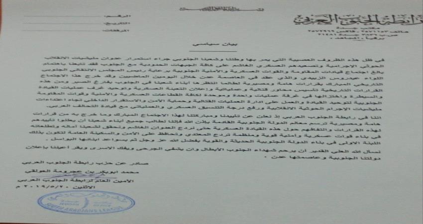 رابطة الجنوب العربي تعلن موقفها من قرارات القيادة الجنوبية " نص البيان"