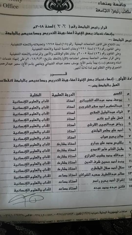 وأصدرت رئاسة الجامعة المعينة من قبل سلطة الحوثيين، مطلع شهر ديسمبر الجاري على فصل 117 أكاديميا من هيئة التدريس بالجامعة، بحجة تغيبهم عن العمل.