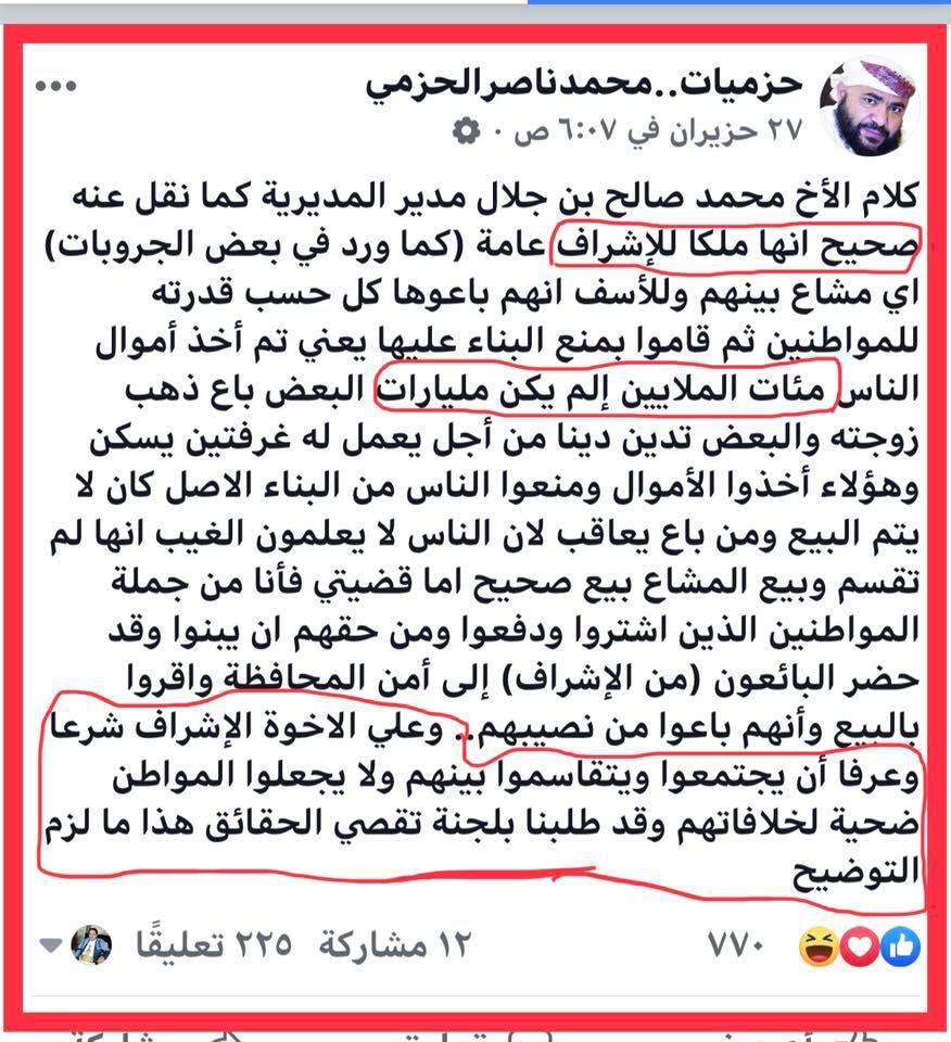 وقال الناشطون ان الخلاف يعود على أرض يمشلكها ” الاشراف ” تتعرض للنهب على يد قيادات في حزب الاصلاح، بينهم محمد الحزمي .