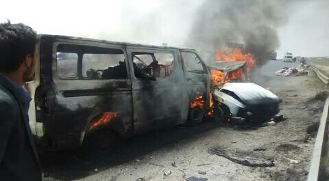 مصادر محلية قالت لـ "خبر" للأنباء ، إن حادث مروري بين سيارة هايلوكس تابعة لبائعي قات وباص نقل ركاب أدى إلى حريق في الباص، كونه يعمل بالغاز، ونتج عنه تفحم جميع الركاب في طريق ذمار القرن بالقرب من مركز التدريب التابع للشرطة العسكرية.