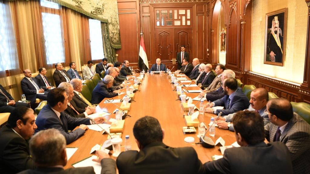 فخامة الرئيس عبدربه منصور هادي رئيس الجمهورية صباح اليوم وبحضور رئيس الوزراء الدكتور معين عبدالملك اجتماعاً مشتركاً لمستشارية ورئيس وأعضاء الوفد المشارك في مشاورات السلام