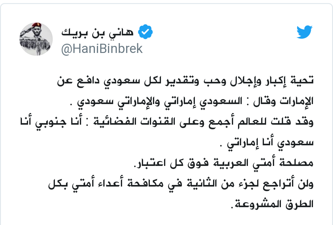 وتابع: تحية إكبار وإجلال وحب وتقدير لكل سعودي دافع عن الإمارات وقال : السعودي إماراتي والإماراتي سعودي .