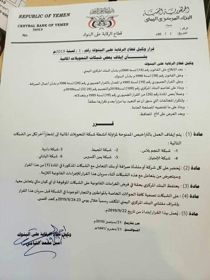 ونص القرار الصادر عن وكيل قطاع الرقابة على البنوك رقم 1 لسنة 2019، على إيقاف العمل بالتراخيص الممنوحة لمزاولة أنشطة شبكة التحويلات المالية إلى إشعار آخر، لشبكات "النجم بلاس، والمحيط، وداديه، والامتياز ويمن اكسبريس، والياباني"..