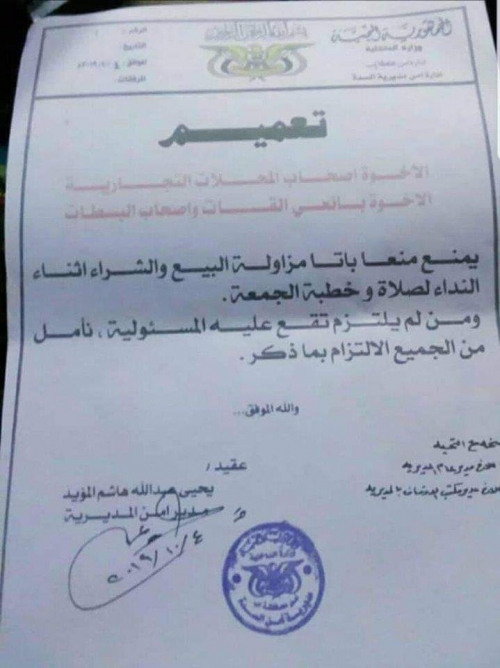 أصدرت جماعة الحوثي ، تعميم جديد بخصوص صلاة وخطبتي الجمعة. وتضمن التعميم، تعليمات لإدخال الناس قسراً للمساجد، وتحميلهم مسؤولية عدم الالتزام بتنفيذ ذلك الصك. وتشهد كافة المساجد في العاصمة صنعاء و المحافظات الواقعة تحت سيطرتها، عزوف شعبي للمواطنين بسبب البدع الدخيلة على الدين الاسلامي وفطرة اليمنيين وتسامحهم وتعايشهم و التي فرضتها المليشيا، في سابقة تؤكد بما لايدع مجالا للشك نية الكهنوت في مواصلة اغتصاب ابناء الشعب اليمني، وممارسة الدجل عليهم باسم الله، ومطية الدين.