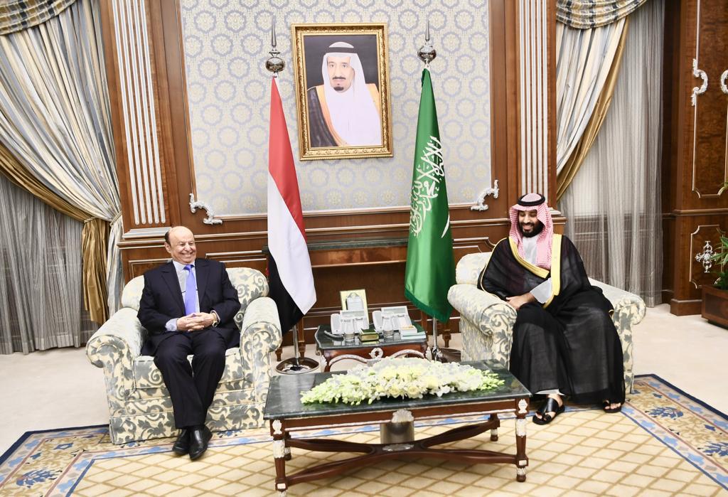 التقى الرئيس عبدربه منصور هادي مساء الليلة الثلاثاء بولي عهد المملكة العربية السعودية محمد بن سلمان بعد دقائق من التوقيع على "اتفاق الرياض".