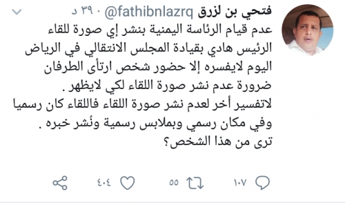 كشف الصحفي الشهير فتحي بن لزرق السر وراء عدم نشر الرئاسة اليمنية لأي صورة للقاء الرئيس هادي بقيادة المجلس الانتقالي في الرياض اليوم.