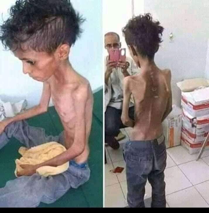 تداول نشطاء في مواقع التواصل الإجتماعي صورة لطفل يمني يعاني من سوء التغذية وأصبح أشبة بهيكل عظمي .