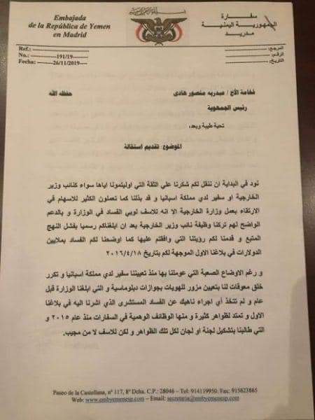 قدّم سفير اليمن لدى مملكة إسبانيا، نبيل خالد ميسري، استقالته إلى الرئيس اليمني عبدربه منصور هادي، موضحاً أن سبب استقالته هو الفساد المستشري وتزوير الهويات الدبلوماسية نظير مقابل مادي والوظائف الوهمية في السفارات منذ عام 2015م.