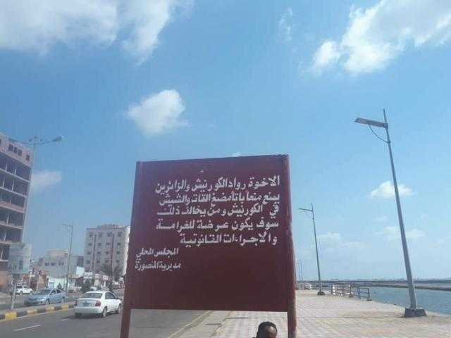 ووضعت السلطة المحلية في مدينة المنصورة لوحة على الكورنيش توضح حظر تعاطي القات والشيش على المواطنين في المنطقة.