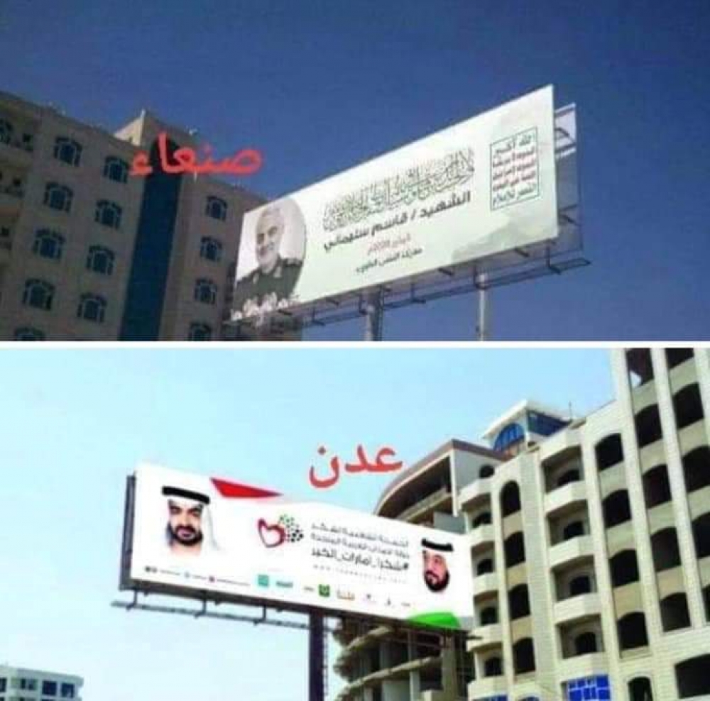 ويظهر في الصورتين تعزية بمقتل القيادي العسكري الايراني قاسم سليماني رفعها الحوثيون في شوارع صنعاء.
