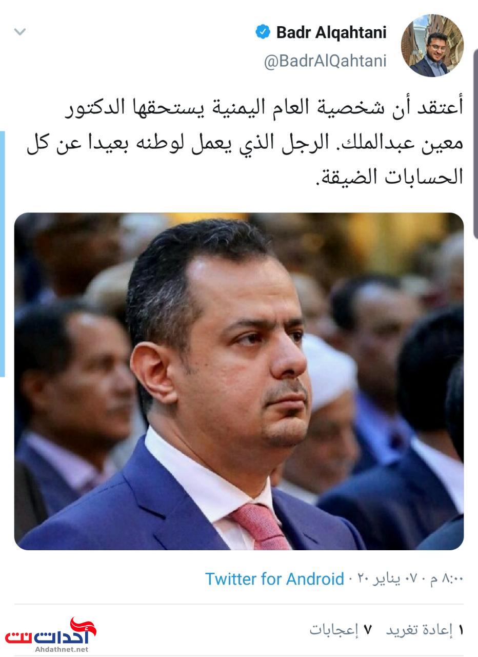 اختار الصحافي السعودي بدر القحطاني، رئيس الحكومة معين عبدالملك شخصية العام اليمنية 2019.