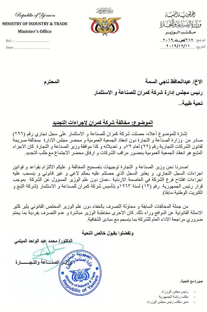 الرئيسية - أخبار محلية - وزير في حكومة معين عبدالملك يحارب الشركة الوطنية للتبغ والكبريت (كمران) بسبب تمردها على الميليشيا الحوثية
