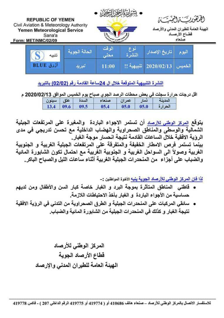 توقع المركز الوطني للأرصاد الجوية، استمرار الأجواء الباردة و المغبرة على المرتفعات الشمالية و الوسطى و المناطق الصحراوية و الهضاب الداخلية، مع تحسن تدريجي في مدى الرؤية الأفقية خلال الساعات القادمة نتيجة انحسار موجة الغبار. و أوضح في نشرته الصادرة الخميس، أن فرص الأمطار الخفيفة والمتفرقة على المرتفعات الغربية و الجنوبية الغربية، وصولا إلى السواحل الغربية و الجنوبية الغربية، مع احتمال تكون الشابورة المائية و الضباب على أجزاء من المنحدرات الجبلية الغربية أثناء ساعات الليل والصباح الباكر. ونبه قاطني المناطق المتأثرة بموجة البرد والغبار وخاصة كبار السن والأطفال بأخذ الاحتياطات اللازمة محذراً في الوقت ذاته السائقين في المنحدرات الجبلية والطرق الصحراوية من تدني الرؤية الليلية.