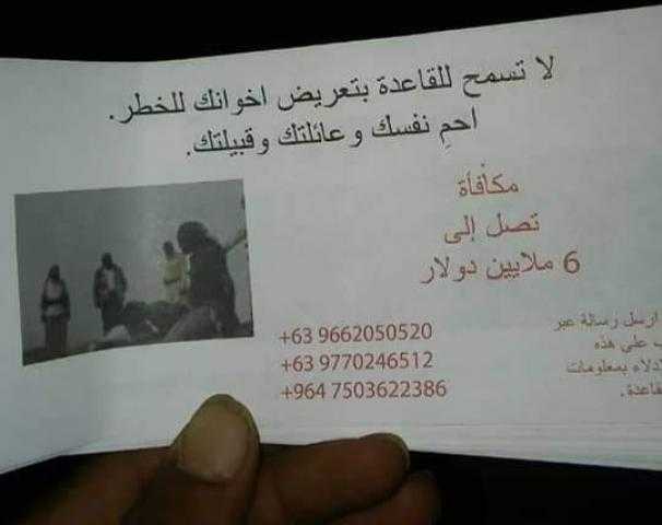 ويظهر في المنشورات عبارات "تخلص من فوضى القاعدة وامن مستقبلك. قدم معلومات"، و "لا تسمح للقاعدة بتعريض إخوانك للخطر. احم نفسك وعائلتك وقبيلتك" و "القاعدة لا تستطيع حماية قادتها، فكيف ستستطيع حمايتك؟"