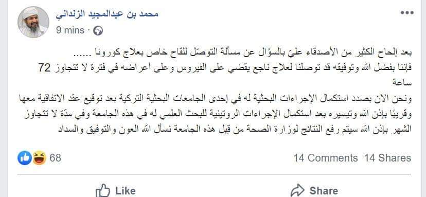 وكتب على صفحته بالفيسبوك؛ " بعد إلحاح الكثير من الأصدقاء عليّ بالسؤال عن مسألة التوصّل للقاح خاص بعلاج كورونا فإننا بفضل الله وتوفيقه قد توصلنا لعلاج ناجع يقضي على الفيروس".
