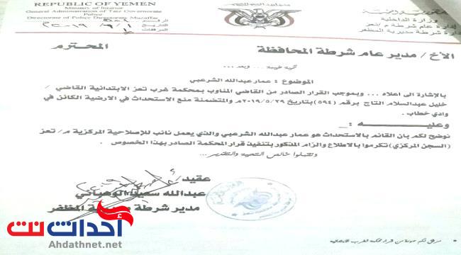 كما صدر الحكم الإستئنافي بتأييد الحكم الإبتدائي وصدرت أوامر أخرى بتنفيذ الحكم ومنها توجيه رئيس محكمة غرب تعز وتوجيه وكيل اول محافظة تعز ووكيل المحافظة لشؤون الدفاع والأمن ومدير الأمن .